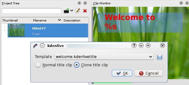 To make use of this feature, you must first create a normal title, then save it (using the "save" icon in titler toolbar). In this title clip, put a text block containing the string "%s".