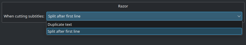 When cutting subtitles with the razor tool (x) or cut clip function (shift + r) there is now an option in the settings to either duplicate the subtitle text or split them after the first line.