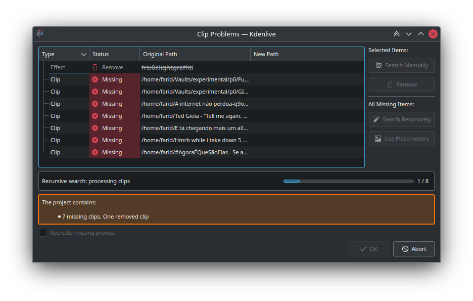 The Document Checker has been completely rewritten following the implementation of sequences. Now, when you open a project, Kdenlive checks if all the clips, proxies, sequences, and effects are loaded correctly. If any errors are spotted, Kdenlive seamlessly sorts them out in the project files, preventing any possible project corruptions