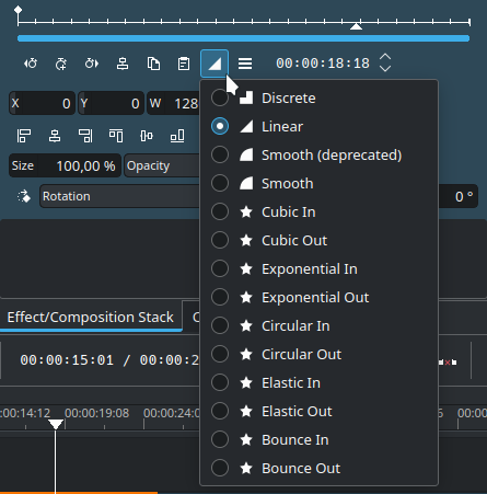 The initial implementation of the long awaited easing interpolation modes for keyframes has landed. Expected soon are easing types (ease in, ease out and ease in and out) and a graph editor.